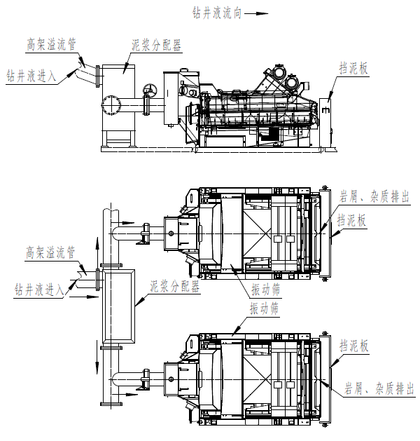 鉆井液通過井口高架溢流管流入振動篩所在一號罐上的鉆井液分配器,進(jìn)入泥漿振動篩,通過振動篩激振效果使鉆井液中的固相巖屑、雜質(zhì)處理到鉆井液意外。