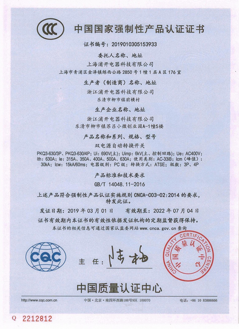 PKQ3-630雙電源證書