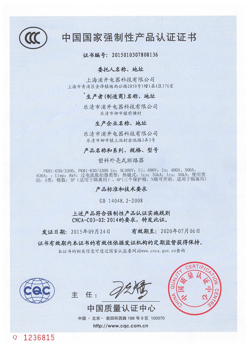 PKM1-630塑殼斷路器證書