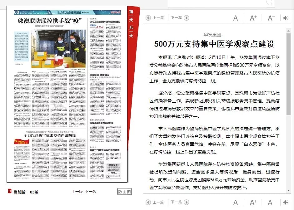 2月10日上午,華發(fā)集團通過旗下華發(fā)公益基金會向珠海市人民醫(yī)院醫(yī)療集團捐贈500萬元專項資金,以實際行動支持我市集中醫(yī)學觀察點的建設管理及市人民醫(yī)院的抗疫工作,全力支援珠海疫情防控一線。
