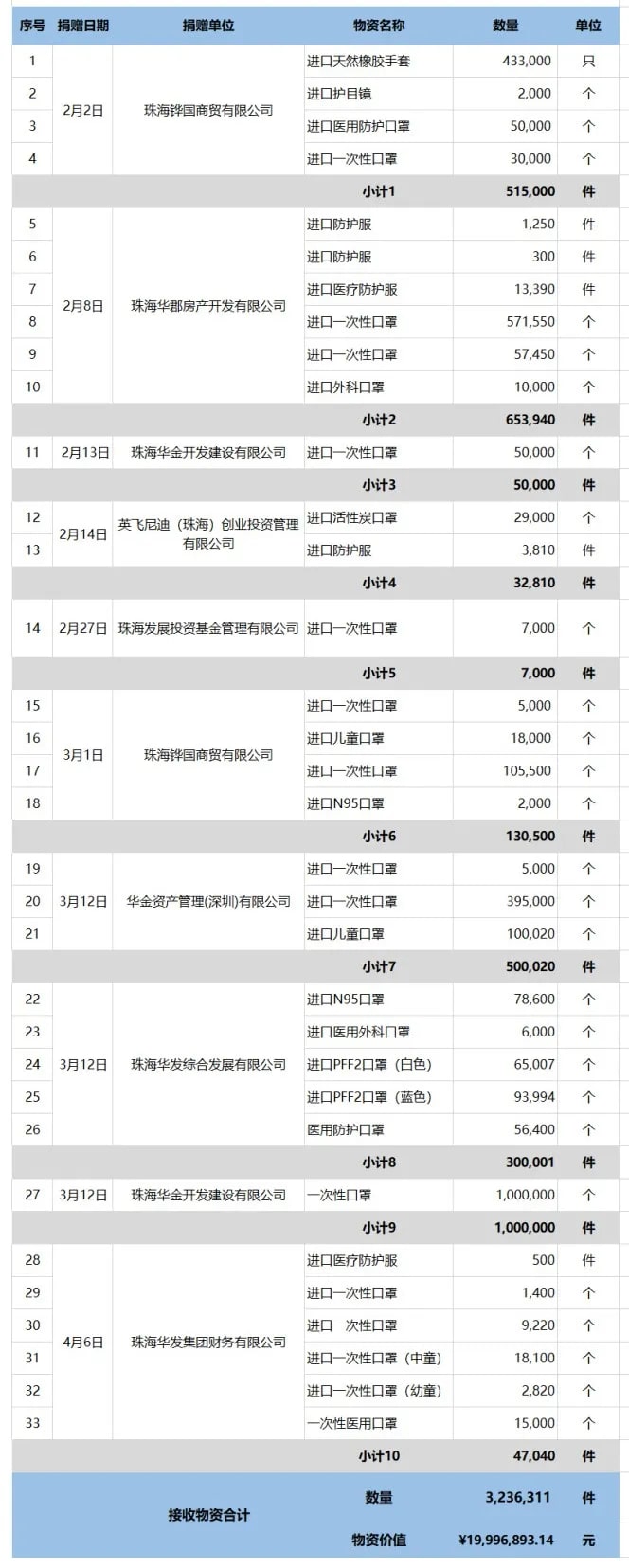 新冠肺炎疫情爆發(fā)以來,截至2020年4月3日,珠海市華發(fā)公益基金會共接收防疫資金及物資(價值)合計21,425,004.16元,捐贈防疫資金及物資(價值)合計26,776,144.16元,物資數(shù)量3,207,871件