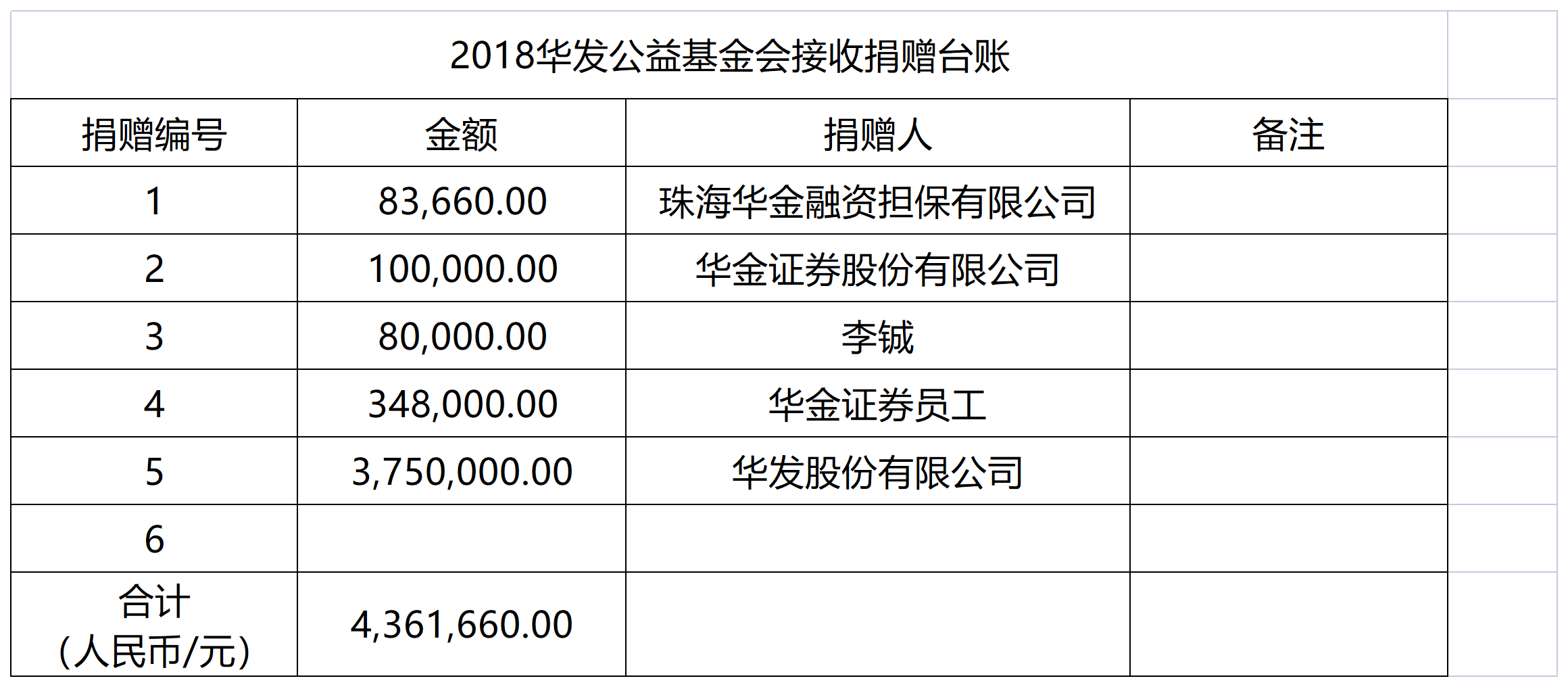 2018華發(fā)公益基金會接收捐贈臺賬